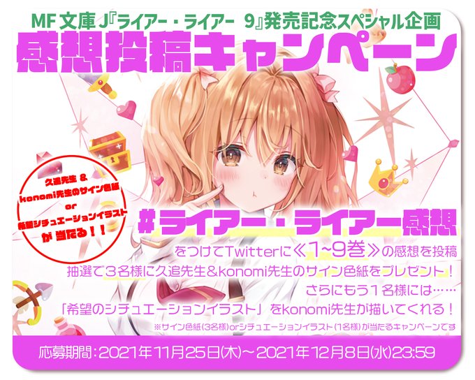 ライトノベル小説『ライアー・ライアー』3巻より、あらすじストーリー内容・発売日情報をお届け! リアル世代最注目! 絶対に負けられない学園頭脳ゲーム&ラブコメ第3弾! ライラスト:konomi(きのこのみ) 発売日:21年11月25日 ライアー・ライアー8 嘘つき転 公開日 16年11月17日 / 更新日 21年4月15日 無料で読める少女漫画 ツイート ライアー×ライアー9巻のネタバレ感想と漫画を無料で読む方法を書いています。 ネタバレを見たく